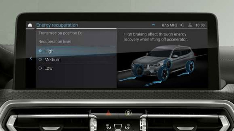 BMW iX3 sử dụng hệ thống phanh tái sinh năng lượng để tận dụng động năng khi giảm tốc và phanh. Hệ thống này chuyển đổi động năng thành điện năng và lưu trữ vào pin điện áp cao của xe, giúp kéo dài quãng đường đi được. Bạn có thể điều chỉnh mức độ phanh tái sinh năng lượng theo bốn cấp độ khác nhau, để phù hợp với p